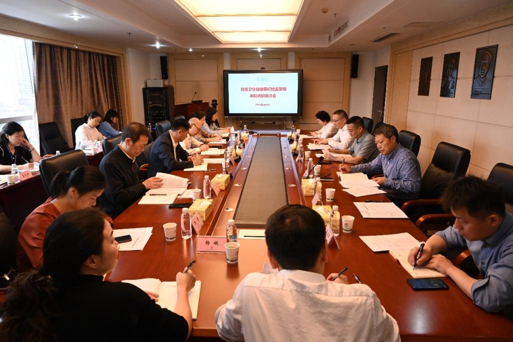 随后,在医院科教楼12楼召开座谈会。党委书记柴湘平介绍了医院总体情况,并汇报了中央巡视反馈问题整改、医德医风建设和住培工作等情况。柴湘平从始终坚持党的全面领导、完善权力运行体制机制、狠抓医院党风廉政建设、深化思想宣传文化工作、加强医疗安全与行风建设等五个方面介绍了医院整改的重要举措和成效。柴湘平强调,在湖南省卫生健康委等上级有关部门和中南大学的坚强领导下,医院把问题整改工作作为“政治必答题”,坚持问题导向、目标导向,层层压实责任,落实落细举措,持续深入推进问题整改整治。
